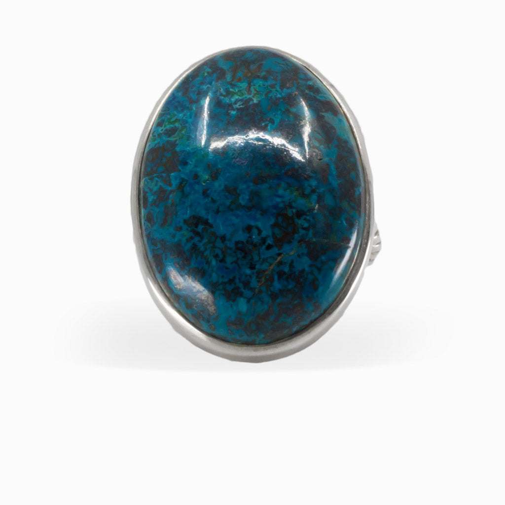 This dreamy mineral features a beautiful blend of vibrant colors of the ocean and is often formed with Malachite, Azurite, and Dioptase. When observed at different angles, natural Shattuckite gemstones exhibit an optical phenomenon showcasing different colors, especially with polarized light. Wear this beauty day or night, the colors will pop and make a statement against any outfit style or occasion. This Shattuckite ring can help re-shape one's reality, providing further growth and assist with spiritual channeling. This mineral can also help you to speak and see the truth while carrying soothing energy to calm the mind.