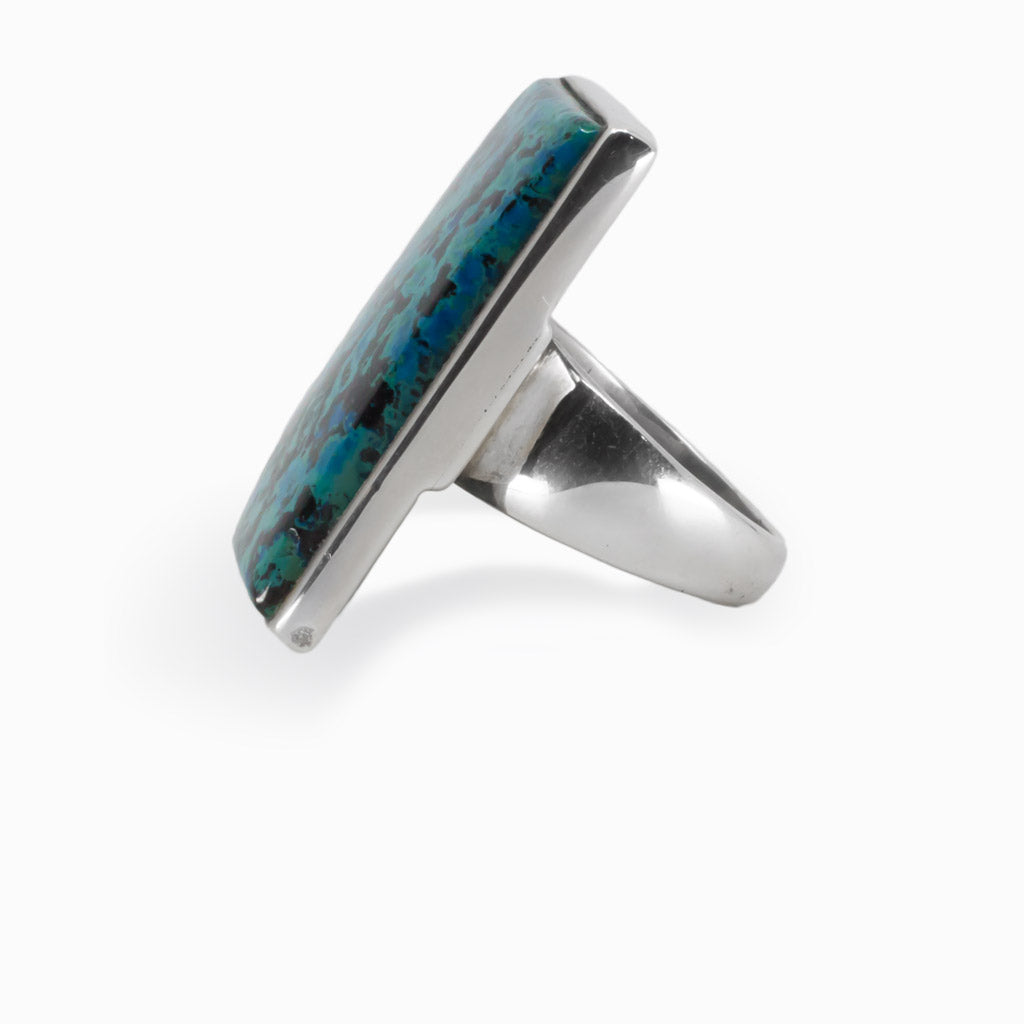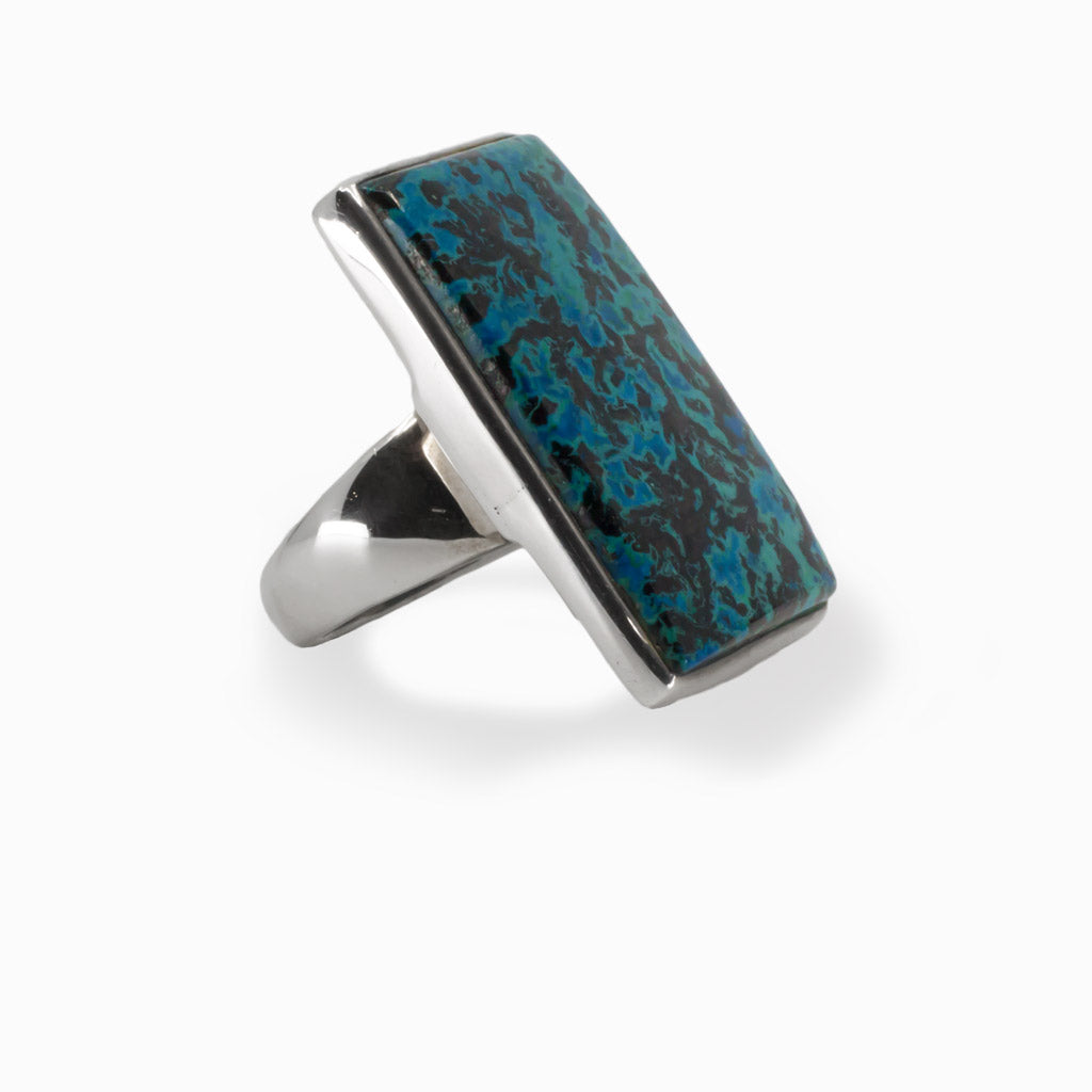 This dreamy mineral features a beautiful blend of vibrant colors of the ocean and is often formed with Malachite, Azurite, and Dioptase. When observed at different angles, natural Shattuckite gems exhibit an optical phenomenon showcasing different colors, especially with polarized light. Wear this beauty day or night, the colors will pop and make a statement against any outfit style or occasion. This Shattuckite ring can help re-shape one's reality, providing further growth and assist with spiritual channeling. This mineral can also help you to speak and see the truth while carrying soothing energy to calm the mind.