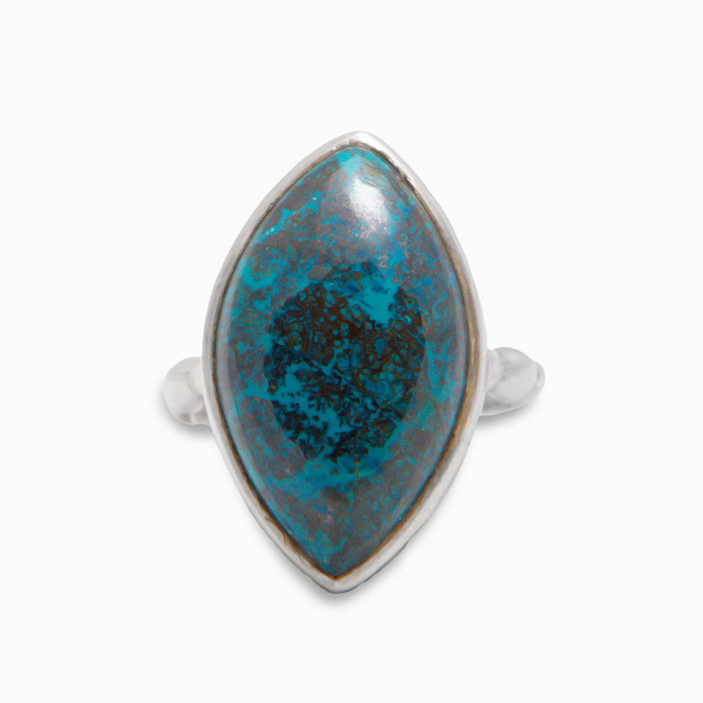 This dreamy mineral features a beautiful blend of vibrant colors of the ocean and is often formed with Malachite, Azurite, and Dioptase. When observed at different angles, natural Shattuckite gemstones exhibit an optical phenomenon showcasing different colors, especially with polarized light. Wear this beauty day or night, the colors will pop and make a statement against any outfit style or occasion. This Shattuckite ring can help re-shape one's reality, providing further growth and assist with spiritual channeling. This mineral can also help you to speak and see the truth while carrying soothing energy to calm the mind.