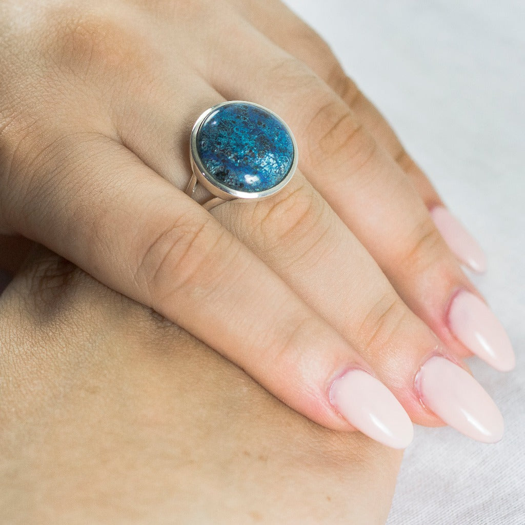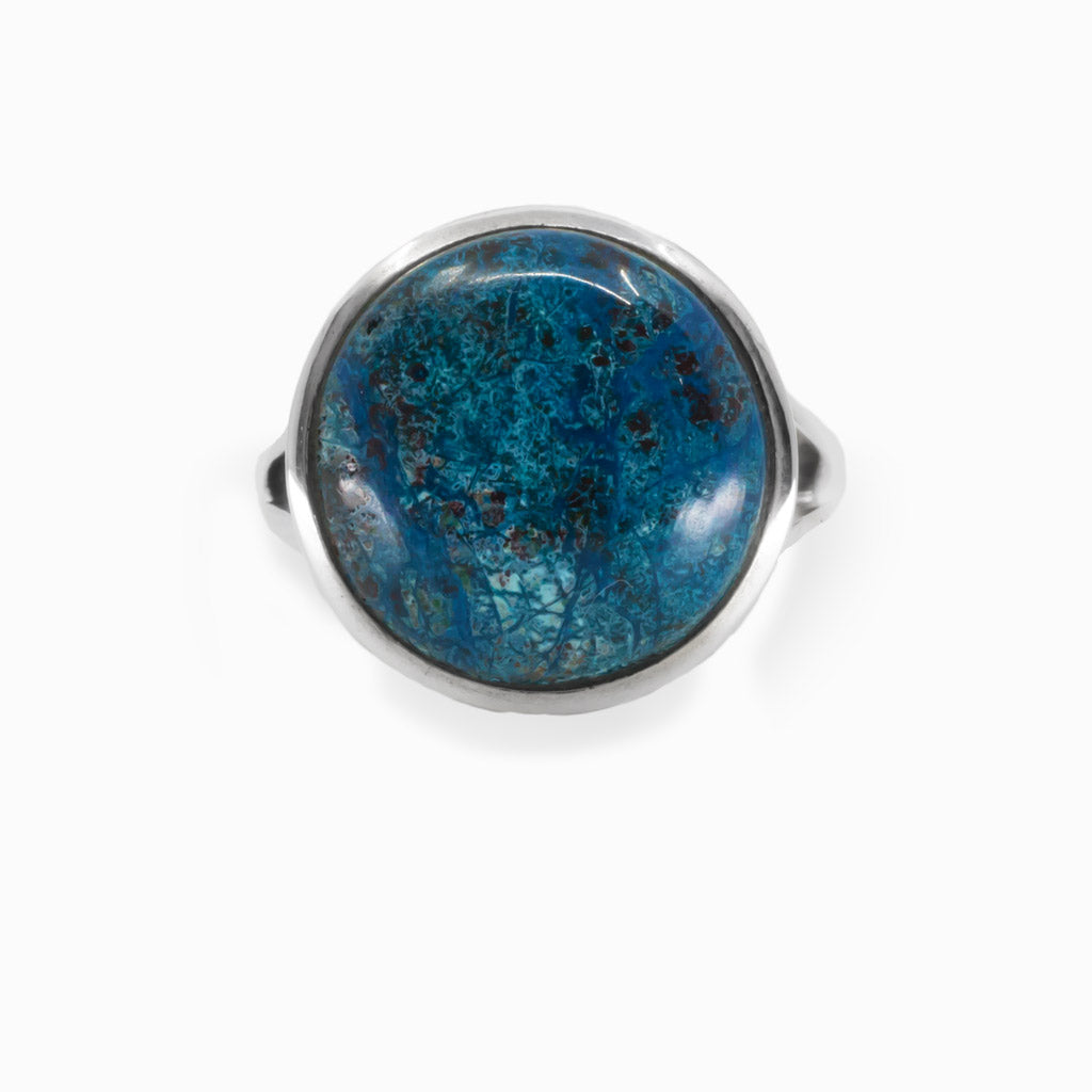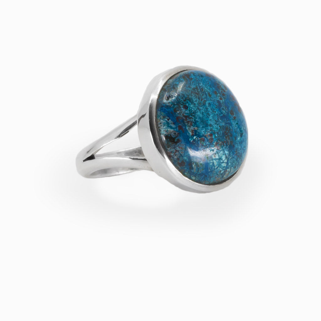 This dreamy mineral features a beautiful blend of vibrant colors of the ocean and is often formed with Malachite, Azurite, and Dioptase. When observed at different angles, natural Shattuckite gemstones exhibit an optical phenomenon showcasing different colors, especially with polarized light. Wear this beauty day or night, the colors will pop and make a statement against any outfit style or occasion. This Shattuckite ring can help re-shape one's reality, providing further growth and assist with spiritual channeling. This mineral can also help you to speak and see the truth while carrying soothing energy to calm the mind.