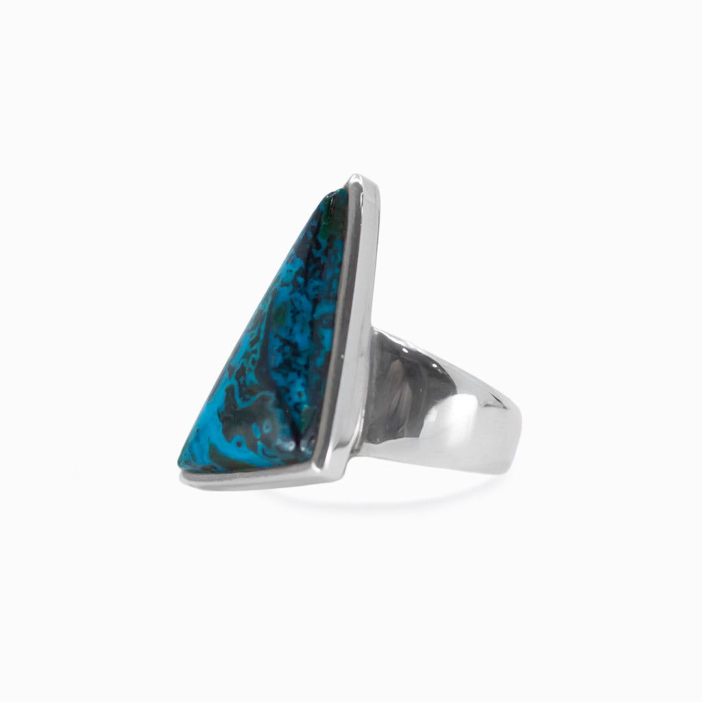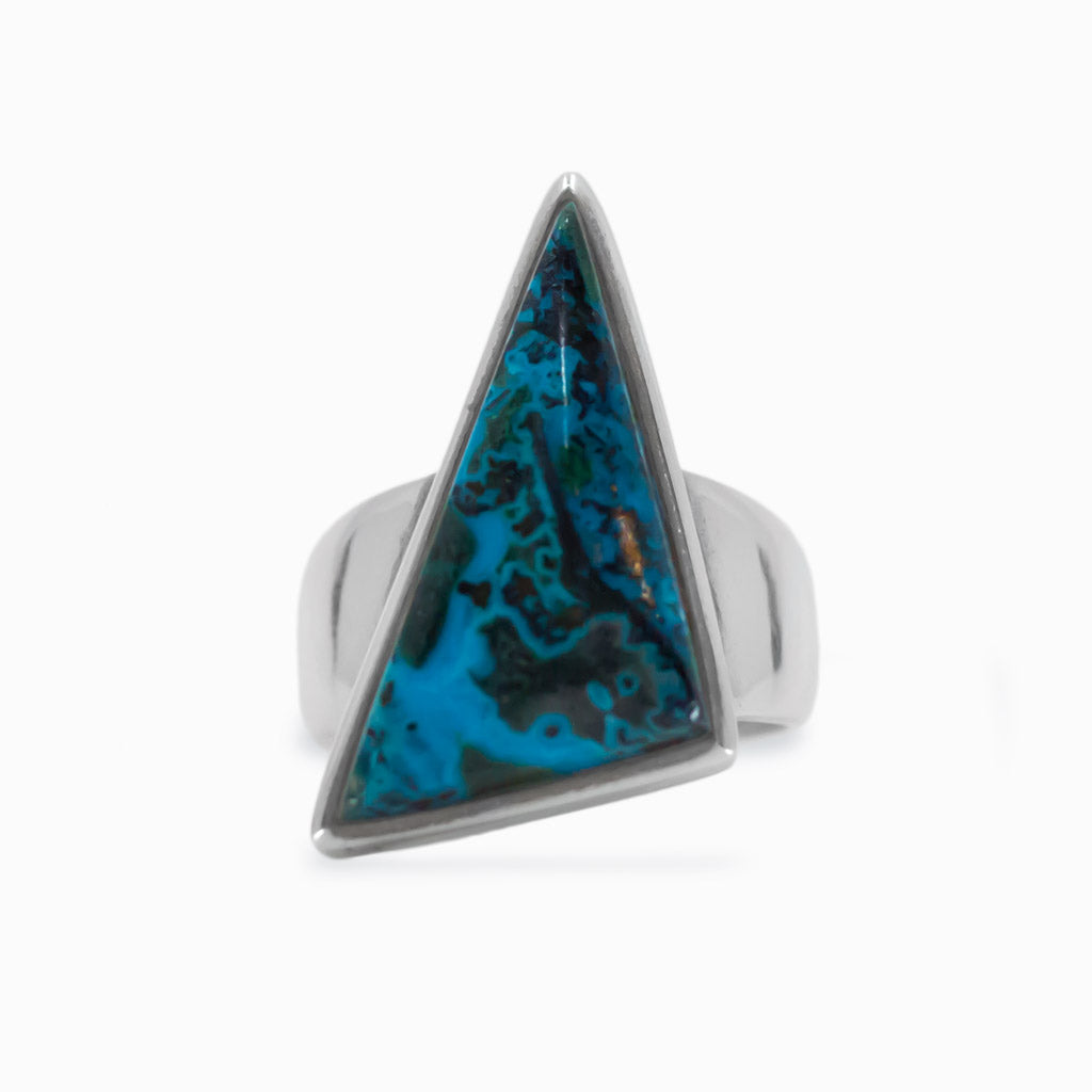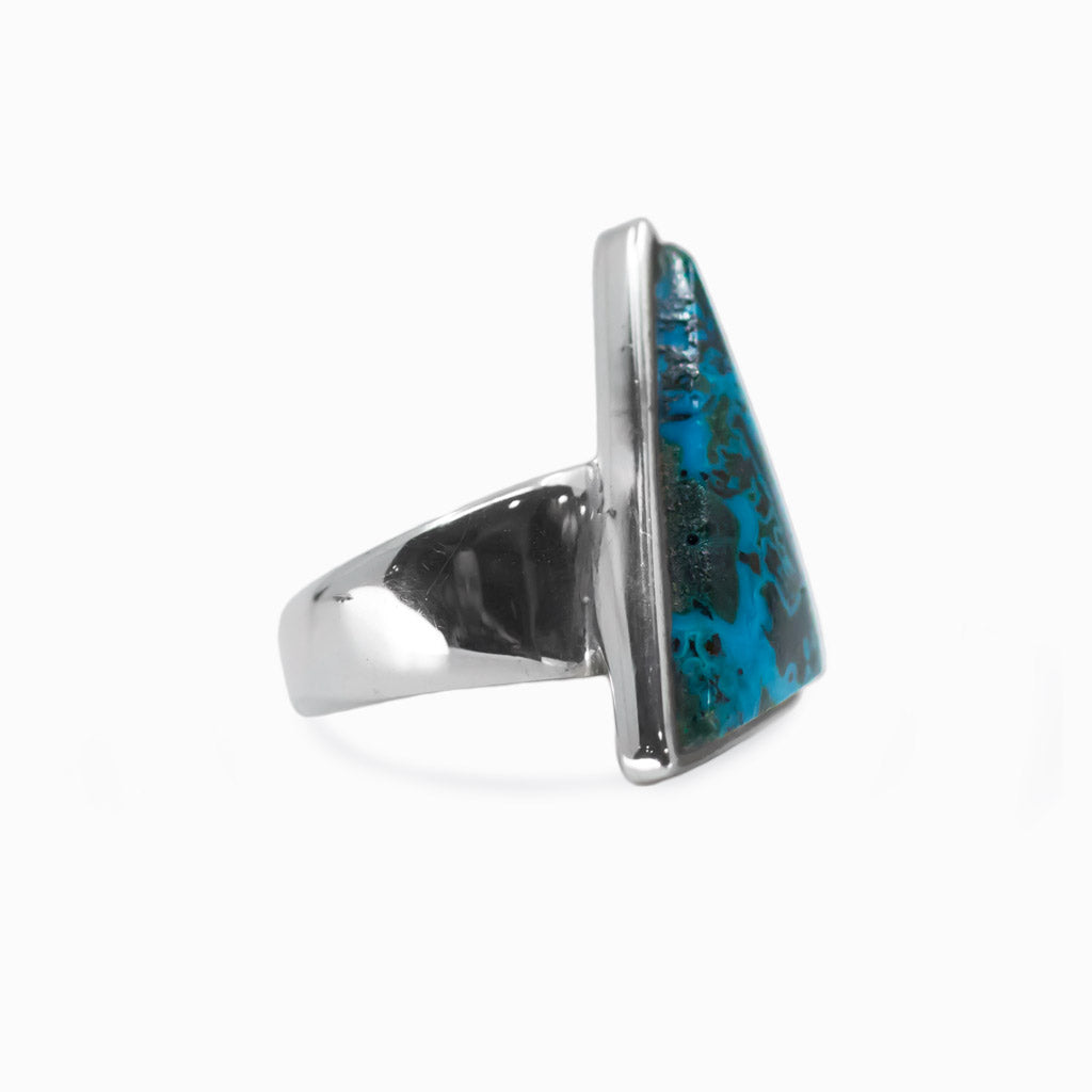 This dreamy mineral features a beautiful blend of vibrant colors of the ocean and is often formed with Malachite, Azurite, and Dioptase. When observed at different angles, natural Shattuckite gemstones exhibit an optical phenomenon showcasing different colors, especially with polarized light. Wear this beauty day or night, the colors will pop and make a statement against any outfit style or occasion. This Shattuckite ring can help re-shape one's reality, providing further growth and assist with spiritual channeling. This mineral can also help you to speak and see the truth while carrying soothing energy to calm the mind.