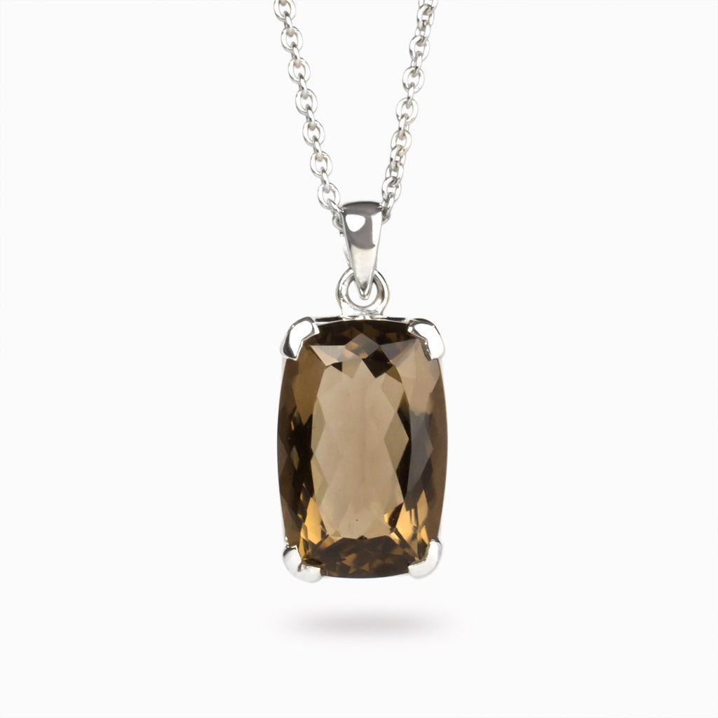 With an even smoky color, crystal clear in clarity, and cut to perfection, pair this versatile stone with any ensemble. Wear this earthy-toned Smokey quartz gem necklace to dissolve negative energies and emotional blockages and allow positive frequencies to fill one's life. Smokey Quartz is a grounding and protective stone that can help balance the mind, whilst providing a barrier of energy that activates one's survival instincts and improves one's intuition. It also promotes personal pride and joy in living.