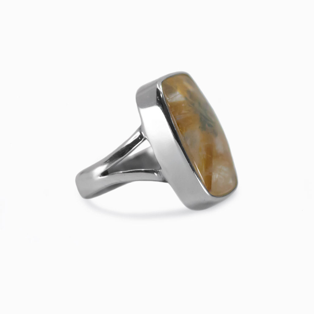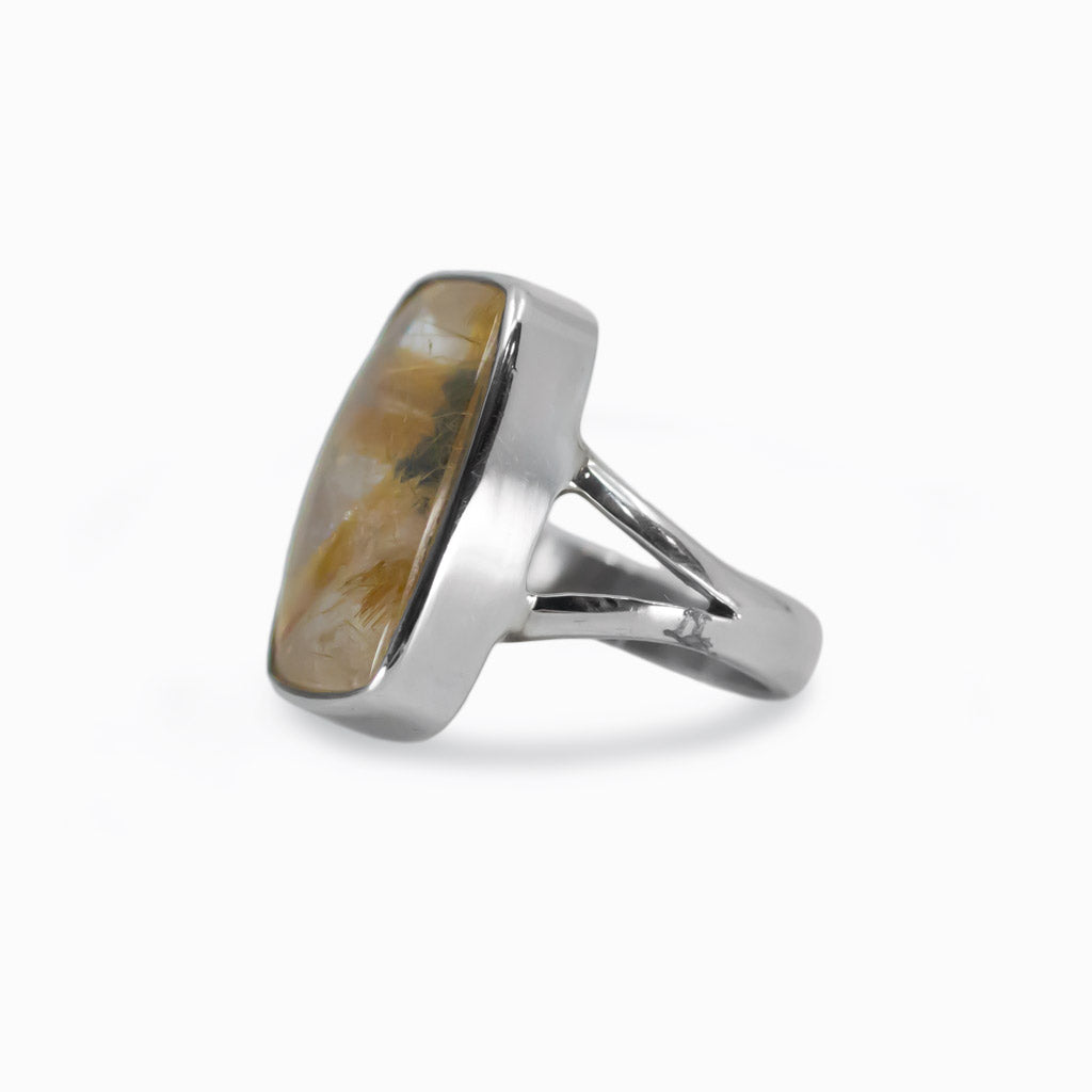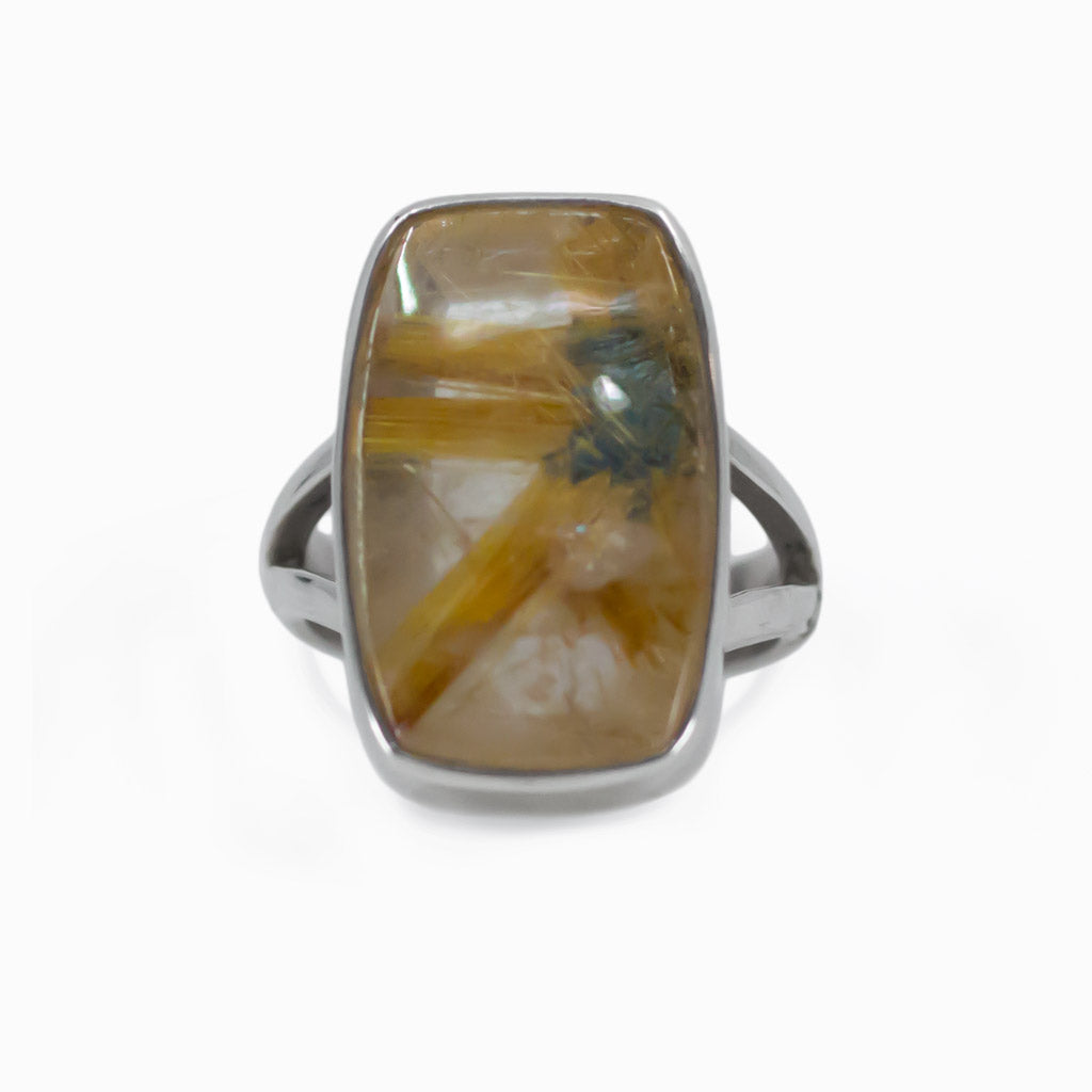 Clear Quartz with striking golden rutile fibers that delivers a breathtaking sparkle. A fine specimen of nature’s abilities, show this gem off however you can. Repel negative energies with this stone and allow it to protect you. This Quartz ring also assists in getting to the root of a problem, allowing one to remedy the situation.