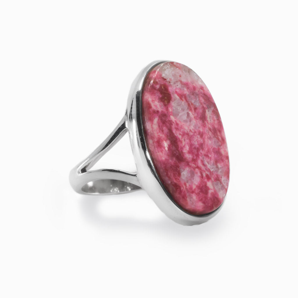 A perfectly pink, rose-pink and white Thulite gemstone in color. Allow this floral-like beauty to really bloom against the spring and summer colors in your wardrobe. This Thullite ring is for the heart and mind and can assist you to combine logic and love. It can instill eloquence in one's character and direction into one's action.
