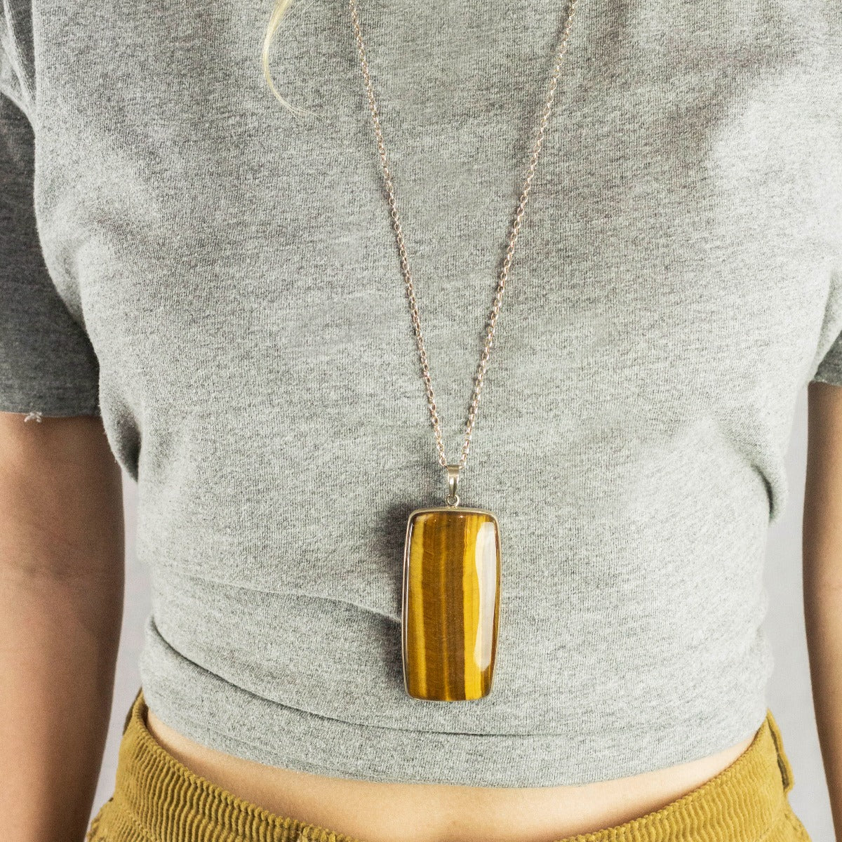 When light reflects off the silky surface of fibrous Tiger Eye, you may almost think you’ve met eyes with the ferocious cat. From its sleek, polished look to its sun-kissed color, This rectangular tiger Eye necklace looks on point day or night. This stone brings together the vibrations of sand and sunlight, combining the energies of the Sun and the Earth. It helps one to become more grounded, as well as bringing its wearer lightness, optimism, and practicality, and awareness to perception.